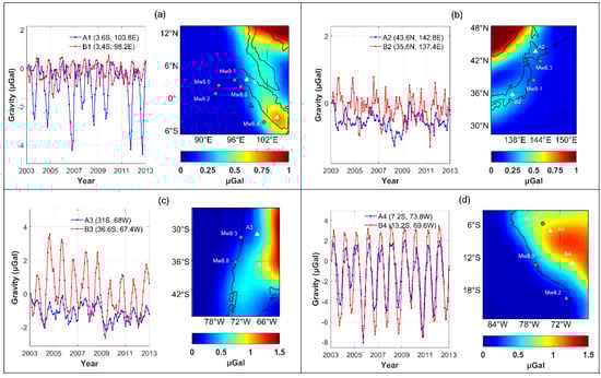According to Figure 2, most large earthquakes with M ≥ 8 occur near Sumatra, Japan, Chile and Peru. In Figure 9, the left figure shows the gravity change caused by hydrological variations provided by GLDAS at points A and B. The right figure shows the distribution map of GLDAS RMS residuals and marks points A and B with white triangles. Figure 9a exhibits the time series of selected points A1 and B1 in Sumatra, with an obvious annual period (−4.5~+0.7 µGal), and the residual RMS of GLDAS in the Sumatra region is probably below 0.7 µGal. Figure 9b shows the time series of selected points near Japan with peak-to-peak a range of −1.3~0.2 µGal. According to the residual RMS distribution, the hydrological signal level is around 0.4 µGal, which is consistent with Li et al. []. Figure 9c,d shows the time series of selected points and RMS variations in Chile and Peru, with the amplitude in the range of −2.6~+3.6 and −8.1~+3.5 µGal, respectively, in which the amplitude variation of the hydrological signal is generally larger than those of Sumatra and Japan. The RMS residuals of these two areas are around 0.7 µGal and 1.2 µGal, respectively, and the error of the GLDAS hydrological model has a significant influence on the extraction of coseismic signals, such as 2015 Mw8.3 Illapel (−0.85 µGal) and 2019 Mw8.0 Peru (−1.1 µGal). Therefore, the interference of land water near the coast of the continental plate (e.g., Chile and Peru regions) is greater than that near the island (e.g., Sumatra and Japan regions), which means that the coseismic gravity change is more difficult to detect near the coasts of continental plates.