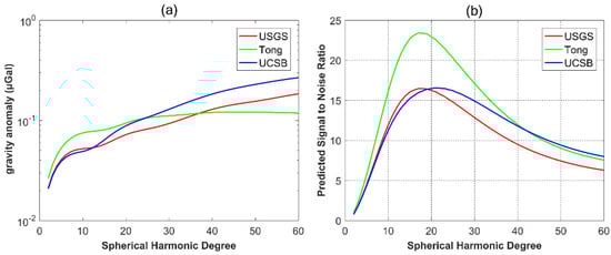 (a) Degree amplitude spectra of 2010 Mw8.8 Maule coseismic gravity changes predicted by different fault slip models. (b) SNR of 2010 Mw8.8 Maule based on different fault slip models in spectral domain. The red, green and blue lines represent USGS, Tong and UCSB model, respectively.