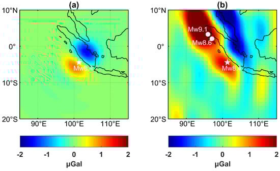 In earthquake-prone areas, the seismic signals will affect each other when the coseismic signals are extracted. For example, there were five earthquakes with magnitude above 8.0 in 2004–2012 in Sumatra, and the postseismic decay of 2004 Mw9.1 Sumatra–Andaman will affect the detection of the coseismic signals of subsequent earthquakes []. Figure 11a shows the predicted coseismic gravity changes of the 2007 Mw8.4 Bengkulu earthquake, which presents a positive–negative spatial pattern near the epicenter, with an amplitude of −1.6~+1.0 µGal; Figure 11b shows the GRACE-observed coseismic gravity changes of 2 years before and after the earthquake, in which the spatial distribution of coseismic signals is consistent with the model prediction in the earthquake area. However, there are obvious gravity signal differences in the northwest, mainly due to the postseismic gravity change caused by the decay of the 2004 Mw9.1 Sumatra–Andaman earthquake. Therefore, the coseismic gravity changes extracted by the stacking method may include the postseismic signals of other earthquakes in earthquake-prone areas. In actual earthquake detection, this issue should be considered.