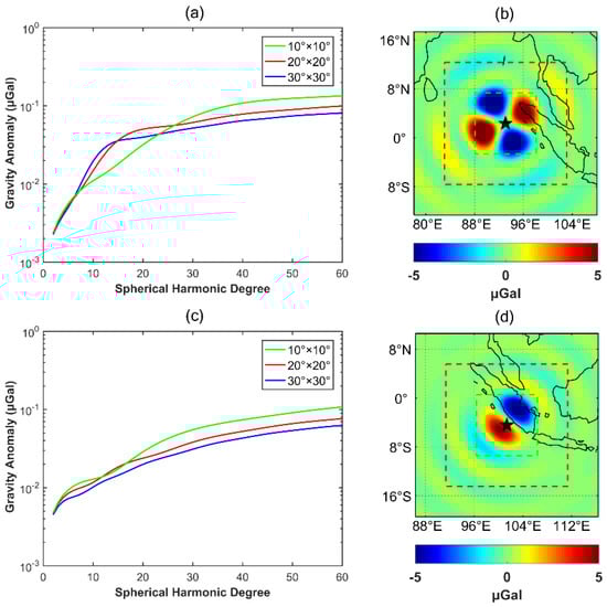 The coseismic gravity change is a local signal, so we use the method in Section 2.1 to evaluate the spectral degree of amplitude of earthquakes. However, different calculation regions will lead to different spectral results. Taking 2012 Mw8.6 Indian and 2007 Mw8.4 Bengkulu as examples, Figure 12 shows the model-predicted coseismic gravity changes with different calculation regions. Note that the results are truncated to degree 60 without filtering processing. The green line in the left figure is the spectral degree amplitude curve of coseismic gravity changes with a calculation region of 10° × 10°, corresponding to the calculation area of the green dotted box in the right figure. It can be found that the calculation area of 10° × 10° contains local signals in a small area, but cannot contain all the main seismic signals, so the high-degree signal is strong whereas the low-degree signal is weak (see Figure 12a,c). The blue line is the result with a calculation region of 30° × 30°, which corresponds to the whole area in the right figure. The calculation area contains the main coseismic signals and more long-wavelength signals. However, with a larger calculation region, the coseismic signals will also be averaged in a larger area and weaken the strength of the coseismic signals. For example, the signals of 30° × 30° are smaller than those of 10° × 10° during degree 30~60 in Figure 12a,c. This study selects 20° × 20° as the calculation region to derive the changes of earthquake in the spectral domain, as shown by the red line in Figure 12. This is because 20° × 20° can contain the main signals of the earthquakes discussed in this study and can also reduce the influence of the signal weakening due to an excessively large region.
