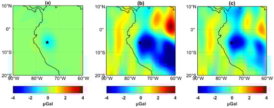 The 2019 Mw8.0 Peru event was an earthquake with a magnitude above 8.0 that occurred during the GFO mission. Thus far, the coseismic gravity change has not been extracted from the GFO observations (as shown in Figure 13). Figure 13a is the dislocation model prediction values, in which the coseismic gravity changes mainly represent a negative pattern near the epicenter, with an amplitude of −1.1 µGal. Figure 13b shows the variations between the GFO observation of 11 months before and after the earthquake, in which there is a negative change near the epicenter, and an obvious hydrological signal in the eastern part of the earthquake region. Figure 13c shows the coseismic gravity change after removing the hydrological signal provided by the GLDAS (−3.7 µGal). Comparing Figure 13b,c, the interference of the hydrological signal is obviously smaller but not completely removed, and obvious stripe noise exists around the epicenter; thus, the gravity changes caused by the earthquake are not shown clearly. According to Figure 9d, the residual RMS of GLDAS in Peru is approximately 1.2 µGal, which is equivalent to the magnitude of the 2019 Mw8.0 Peru coseismic signal. Hence, the influence of hydrological signals may be one of the reasons that this earthquake has not been detected so far.