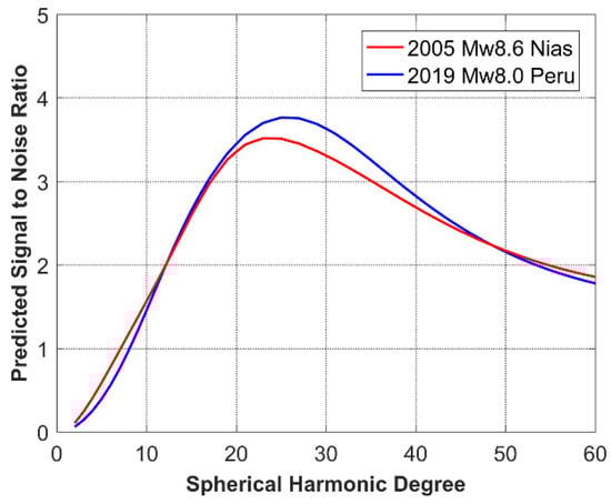 Ratio of the coseismic gravity changes to cumulative error of stacking method in spectral domain. The blue line is the ratio of the coseismic signal of the 2019 Mw8.0 Peru earthquake to the error of the GFO stacking method. The red line is SNR of the 2005 Mw8.6 Nias event for the GRACE error.
