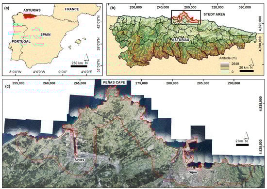 (a) Location of Asturias in the N of Spain; (b) central coast of Asturias study area; (c) study area, with principal cities of Avilés and Gijón and the Peñas Cape location; OrtoPNOA 2017 CC-BY 4.0 scne.es.