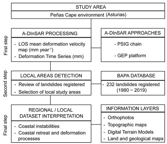 This section describes the procedure followed in this work (Figure 2). Firstly, we applied A-DInSAR techniques by exploiting Sentinel-1 A/B images of the study area. Secondly, the BAPA database was used to establish the key local areas. The data provided by A-DInSAR were analyzed, both at regional and local scales, in order to identify and interpret the coastal instabilities and their relationships with coastal retreat.