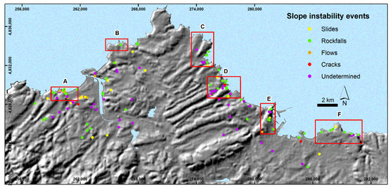 Geographical distribution of coastal slope instabilities registered in the BAPA database [46] between 1980 to 2019. Red rectangles indicate areas studied more in depth: A-Salinas Town, B-Podes Peninsula, C-Luanco Town, D-Candás Town, E-Musel Port and F-Peñarrubia Beach. DEM with 5 × 5 m pixel resolution.