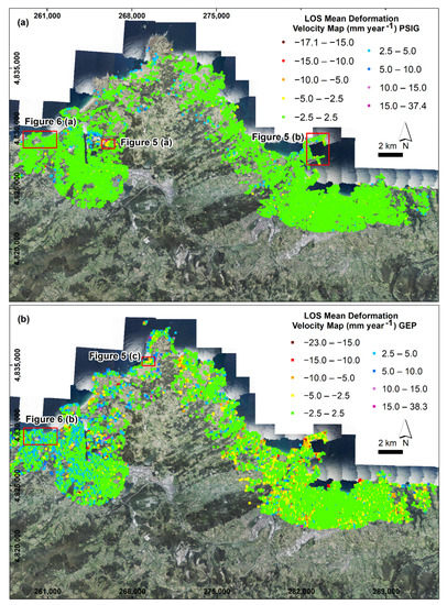 The LOS mean deformation velocity maps obtained by the two approaches (Figure 4 and Figure 5) allowed us to observe similar VLOS rates at a regional scale. PSIG has measured VLOS rates from −17.1 to 37.4 mm year−1 and GEP has measured VLOS rates from −23.0 to 38.3 mm year−1. Nevertheless, they present important differences in the interpretation of the obtained datasets at regional and local scales. Some of these differences are observed in the squared areas (Figure 6a,b) in Figure 4. These differences in A-DInSAR patterns are mainly that the number of positive PS on the GEP VLOS map (36.4% of positive PS with VLOS > 2.5 mm year−1) are greater than PSIG VLOS map (1.4% of positive PS of PSIG). The different results obtained by both approaches could be explained by the following factors; (1) the pixel resolution of software (14 × 4 m for the PSIG product versus 90 × 90 m for the GEP product), (2) the degree of selection and manipulation of the input parameters during the processing, (3) the technique implemented in each approach: thus, PSIG software is based on the PSI technique [2,3,56], while the GEP service has implemented the P-SBAS technique [1,62], (4) the variable amount, in each processing, of the uncorrected atmospheric component and (5) the location of the reference points.