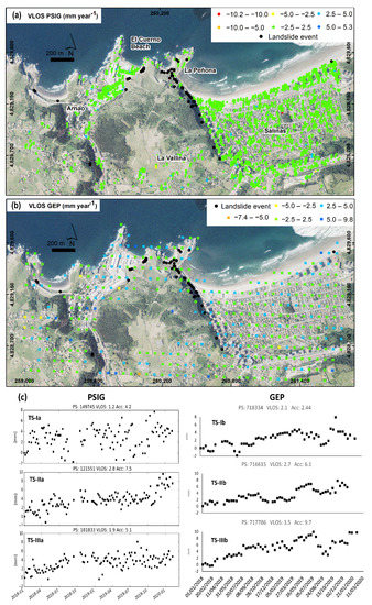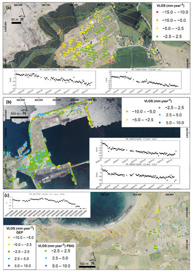 Both approaches used have allowed the detection of different coastal instabilities at a regional scale (Figure 5). Firstly, in Figure 5a, the deformations (with VLOS rates between −12.4 and 0.6 mm year−1) are located in an electrical sub-station, in which ground movements have been related with slope instabilities that have developed on (i) destabilized slope and ii) anthropic fill settlements [63]. Secondly, different ground movements were detected in the Musel Port (Figure 5b), with VLOS rates between −8.6 and 6.3 mm year−1. These movements are produced by wave processes, tides, and the migration of sandy sediments. Additionally, being an area reclaimed from the sea, the deformations may be due to ground settlement taking place in the filler materials [64]. Positive accumulated ground motion trends can also be distinguished due to: i) accumulation of materials (anthropic activities) and (ii) different affections on the breakwater wall that produce a relative movement towards the satellite. Finally, GEP has allowed deformations to the West of Peñas Cape to be detected and identified (Figure 5c), with VLOS from −9.1 to 8.1 mm year−1. The affected materials are the bedrock and overlying rasa deposits. The authors of [45] indicate that the West of Peñas Cape shows the greatest coastal retreat in the area, with 13.38 m between 2006 and 2017. We suppose that these deformations, from −2.5 to −9.1 mm year−1, are due to coastal instabilities, which may be directly related to erosion of the cliff foot and undercutting sea action.