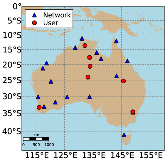 In this study, the processing is performed using 30-s Galileo code and phase observations on E1, E5a, E5b, E5 and E6, collected by continuously operating reference stations (CORS) belonging to the Australian Regional GNSS Network (ARGN) on three days starting from DOY 166 of 2020, which is an arbitrary choice. The geographic distribution of the 17 network stations for the estimation of network corrections and of the seven user stations for PPP-RTK positioning is shown in Figure 1. All stations are equipped with Septentrio PolaRx5 receivers, which are able to track all five frequency signals of Galileo. The cut-off elevation mask for all the data analysis in this work is set as 10.