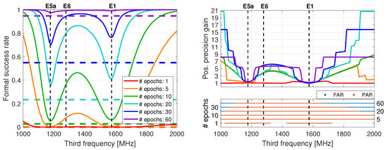 The above results underline the importance of an increased number of frequencies, which can boost the user ambiguity resolution capabilities. In achieving the highest possible FAR success rates, the user should opt for signals with frequencies that are as far as possible from the two ‘starting’ ones. Since a considerable amount of time is needed to achieve reliable FAR with a success rate higher than , we opt to fix only a subset of the ambiguities with the same criterion in order to obtain a considerable precision gain in shorter time. In the top-right panel of Figure 3, we present the positioning precision gain after successful PAR as the ratio of the float and fixed horizontal positioning precision, as a function of a varying third frequency and an increasing number of epochs. We reasonably opt to show the precision gain after PAR, rather than the formal success rate, as done in FAR, because the PAR success rate, by definition, is larger than , and therefore not sufficient to show the contribution to the user performance.