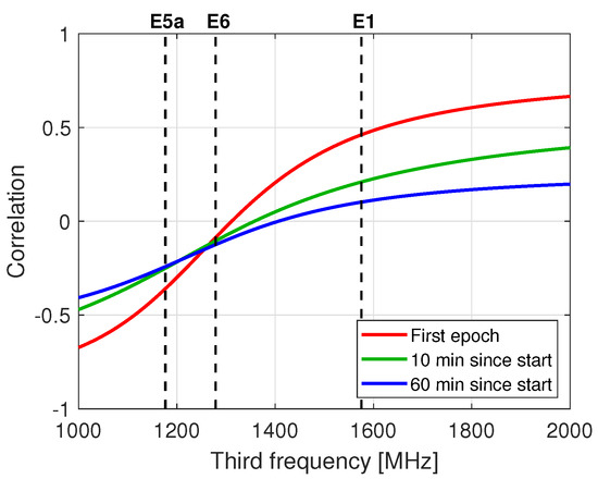 Figure 4 presents the correlation coefficient between the user-estimated satellite code biases and float ambiguities of a representative individual satellite as a function of a varying third frequency. The stated correlation is shown to range up to 0.65 (in magnitude). Moreover, it is observed that the correlation for E6 is smaller than that for E5b and E5. Therefore, one expects that the provision of the satellite code bias corrections will have a stronger impact on user ambiguity resolution and convergence performance when E5 or E5b is selected as the third frequency than when E6 is used.