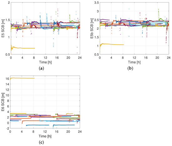 Figure 5 presents the multi-frequency code bias estimates of the Galileo satellites on DOY 166 of 2020. It can be seen that the code biases of all satellites show, after their initial convergence period, remarkable time-stability. Moreover, one can observe another interesting feature of the E5b and E5 SCBs. For most of the Galileo satellites the E5b and E5 code biases fluctuate within a narrow range of about 50 and 25 cm, respectively. Given that these estimable satellite code biases are functions of the modern and legacy DCBs (cf. Equation (3)), and due to the magnitude of the coefficient of one of them that is close to the value one for these frequencies, one may reasonably conclude that the absolute satellite code biases on E5a, E5b and E5 are almost identical. As a result, the satellite DCBs between E5b and E5 signals are almost zero, as also shown in Li et al. [50]. The only exception to this case is satellite E24, for which a code bias of larger magnitude is seen, while high differential biases have also been reported earlier in Ammar et al. [51]. In the case of E6, we observe that the satellite code biases do not fluctuate within a narrow range, unlike E5b and E5, indicating that the satellite DCBs between E6 and the other signals are not equal to zero. For the same reason as before, the E6 code bias of satellite E24 shows a large offset compared to those of the other satellites.