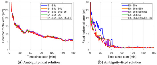 Figure 6 shows the convergence behaviour of the standalone Galileo multi-frequency ambiguity float (left panel) and PAR-fixed (right panel) kinematic horizontal radial positioning errors, whereas those for the vertical errors are not shown for brevity, but their achieved convergence times in both ambiguity float and fixed setups are listed in Table 3. The ambiguity-float solutions, with time-constant ambiguities, gain a high accuracy over time, because the float ambiguities become more precise over time and, as a result, the positioning accuracy is dictated by the very precise phase data. Adding more frequencies to the system seems to bring only slight improvements, with similar results being shown in Guo et al. [29], due to the invariance of satellite geometry [52]. It is clear that the float solutions do not converge to 5 cm within the first 3 h, and the results in Table 3 reveal that more than 1 h is needed for the horizontal errors to go below and stay below 10 cm for all multi-frequency solutions.