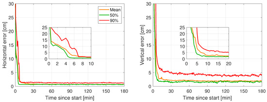 Such a gain in performance is also observed in the vertical positioning results. We observe that the vertical positioning errors are better than 10 cm after 7.0 min in 90% of cases, or after 5.0 min on average. The achieved vertical positioning accuracy, after convergence, is 4.3 cm. With these results in mind, we show that applications requiring fast high-accuracy results also in the vertical component can benefit from the combined system.