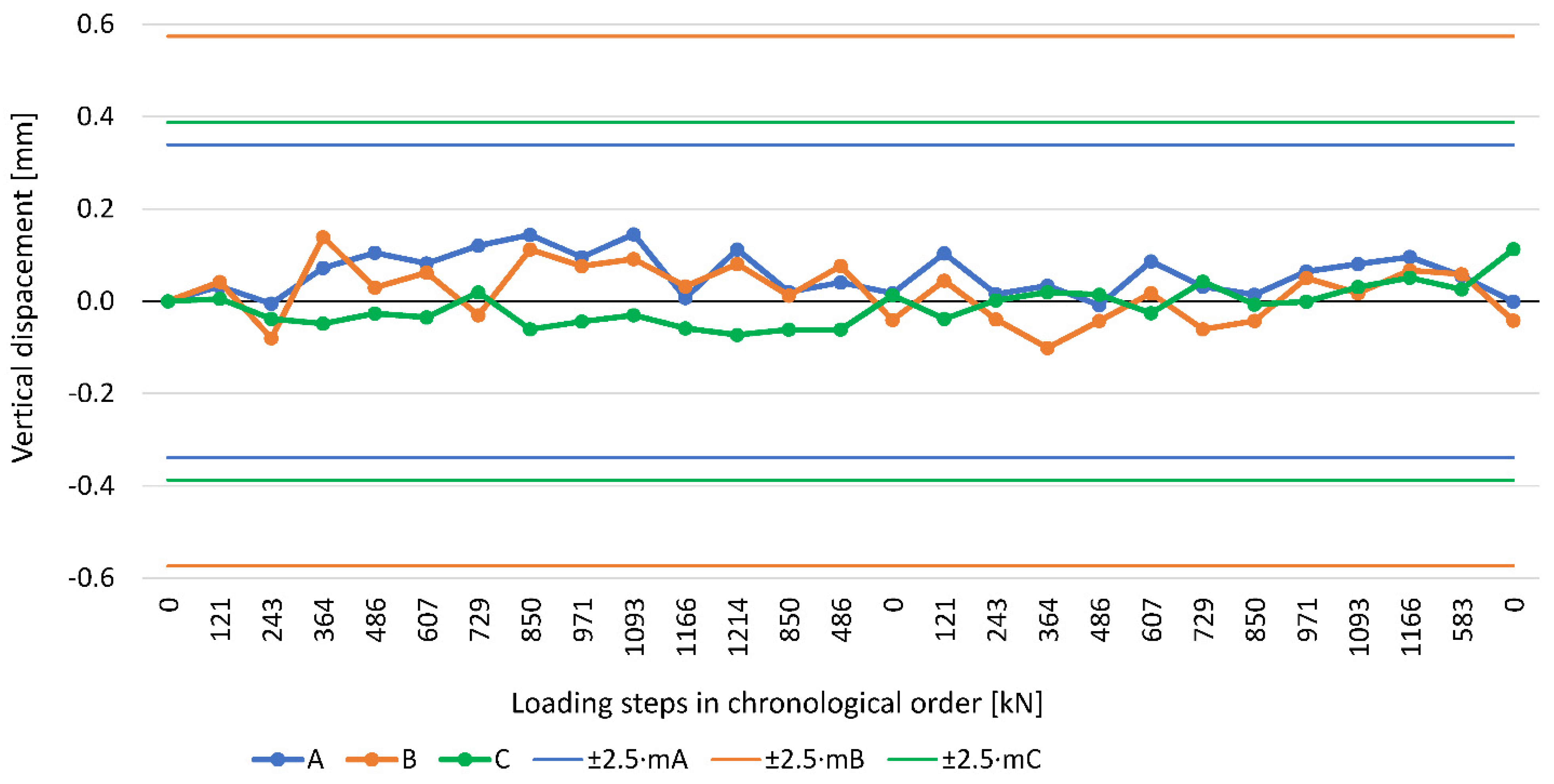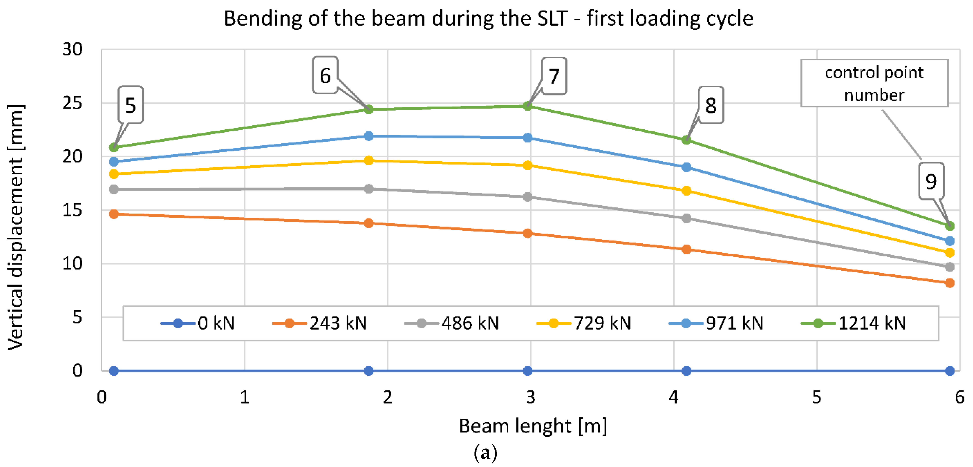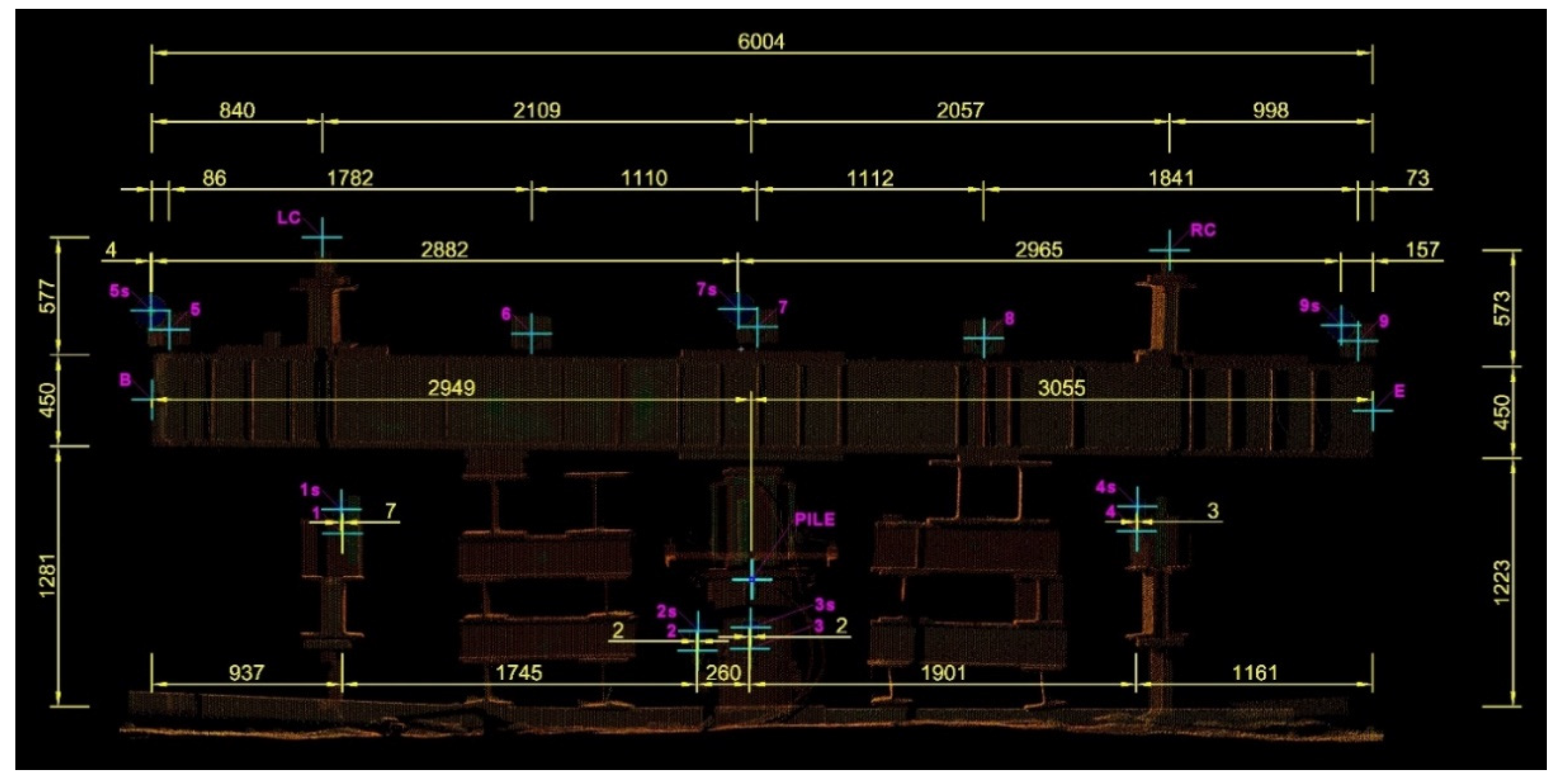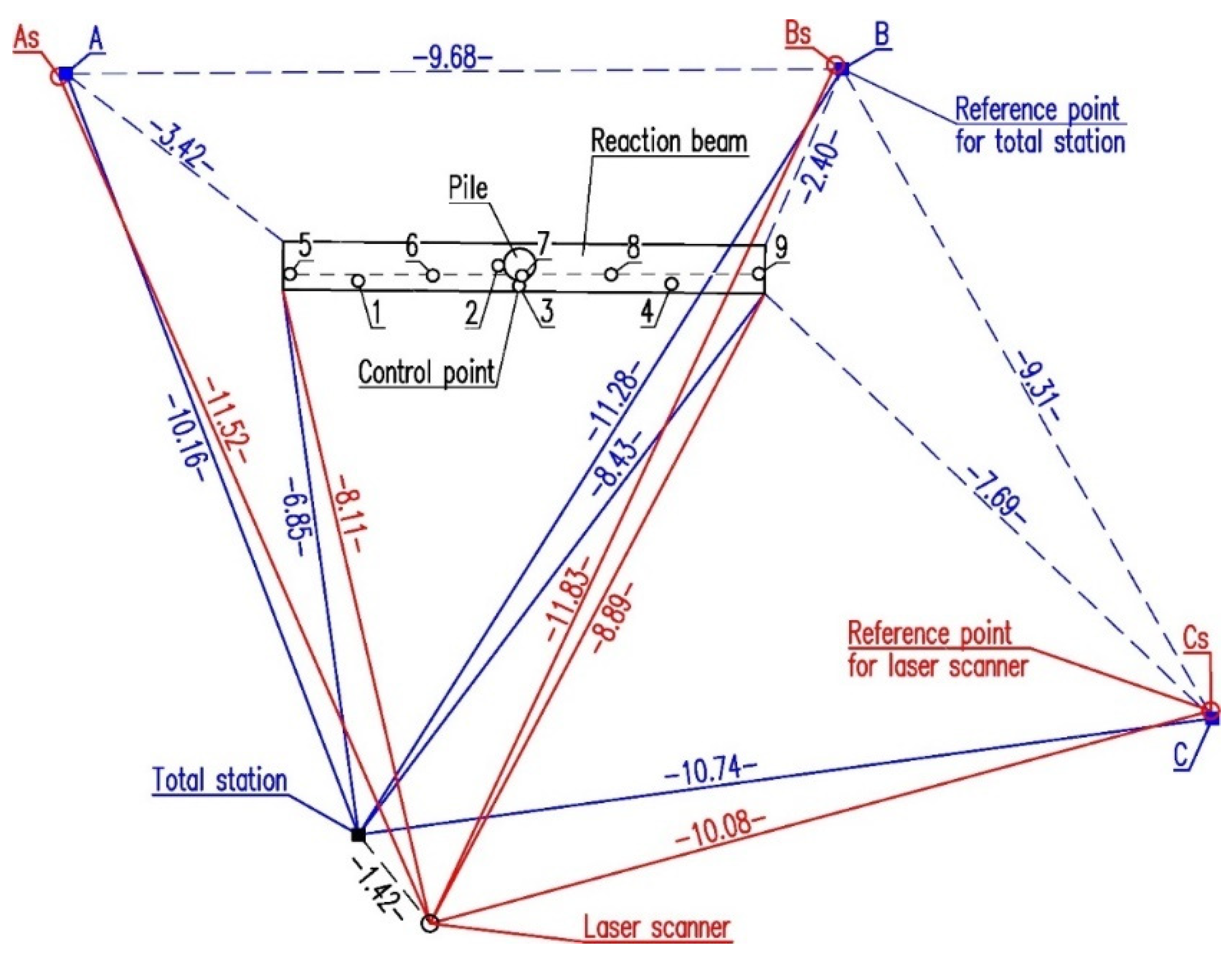 - five points (numbers 5–9) located on the reaction beam and materialized by geodetic prisms with a diameter of 62.5 mm and prism constant of −30 mm;