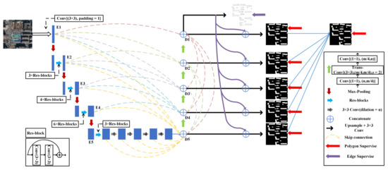 The powerful feature extraction and interpretation ability of semantic segmentation provides a new method for the interpretation of high-resolution remote-sensing images, which is helpful for the accurate extraction and positioning of buildings and reduces the problems of false extraction and missing detection of buildings. Liu et al. [23] proposed a spatial residual inception network (SRI-Net), in which an SRI module captures and aggregates multiscale contexts for semantic understanding by successively fusing multilevel features. SRI-Net is capable of accurately detecting large buildings while retaining global morphological characteristics and local details. Delassus et al. [24] proposed a fusion strategy based on U-Net [19], which combines the segmented output of the combined model and multiple channels of the input image. Lin et al. [25] proposed an efficient separable factorized network (ESFNet), which uses separable residual blocks and dilated convolution to maintain a small loss of accuracy as well as low computational cost and memory consumption. At the same time, the high precision of semantic segmentation is maintained. Yi et al. [7] proposed a ResUNet based on U-Net and Resnet. It uses a deep residual learning method to promote training and alleviate the problem of model training degradation. Shuang Wang [26] proposed a full convolutional network with dense connections that designed top-down short connections to facilitate the fusion of high and low feature information. However, there are usually irregular boundaries that are difficult to completely match the boundaries of the actual building, and it is impossible to effectively distinguish adjacent buildings [5].