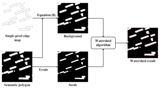 we use the watershed algorithm [34] to delete the redundant semantic polygon and extract the edges. According to the input seed points, the watershed algorithm delimits the region ownership of each pixel, and the value of the boundary between regions is set to “−1” to distinguish. Accurate semantic polygons are used to mark the seed points inside the restricted semantic polygon. The seed points come from the erosion operation of semantic polygons. To prevent the disappearance of seed points due to excessive erosion operations, we choose to iterate five times to obtain seeds after many experiments. Then, the desired correctly predicted polygon boundary is obtained (as shown in Figure 3d). Then, we use the hole filling algorithm to fill boundaries into semantic polygons. At this time, we can ensure that all the semantic polygons are within the single-pixel edge. The details of the watershed algorithm are shown in Figure 4.