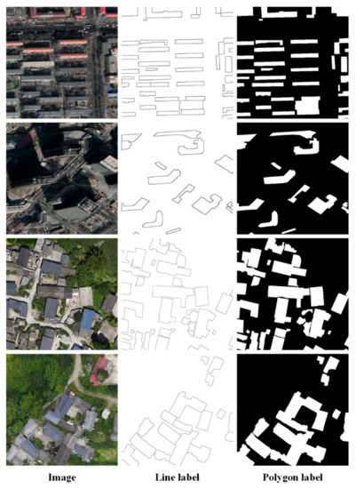 We select samples with typical architectural features and a certain number of negative samples that do not contain buildings in the abovementioned study area, draw the precise boundary of the building manually, generate corresponding line labels and polygon labels, and randomize divide 80% of the samples are used as the training set, and 20% of the samples are used as the test set. The Beijing area contains 320 training sets of 512 pixel × 512-pixel images and 80 test sets of 512 pixel × 512-pixel images. The Zhonglu area contains 75 training sets of 1024 pixel × 1024-pixel images and 23 test sets of 1024 pixel × 1024-pixel images. The data set is shown in Figure 6.