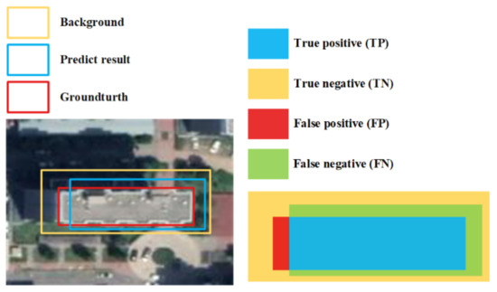 The F1 score is an index used to measure the accuracy of a two-category model. To calculate the F1 score, it is necessary to calculate the precision and recall. In the following formulas, true positives (TP) represent the number of positive pixels belonging to buildings that are correctly identified. True negatives (TN) represent the number of negative pixels belonging to nonbuildings that are correctly identified. False positives (FP) represent the number of negative pixels belonging to nonbuildings that are incorrectly identified as positive pixels belonging to buildings. False negatives (FN) represent the number of positive pixels belonging to buildings that are incorrectly identified as negative pixels belonging to nonbuildings. The explanation of the above TP, TN, FP, FN indicators is shown in Figure 7.