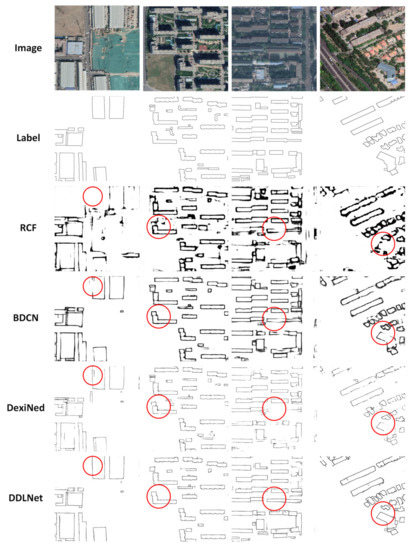 In the Beijing dataset, RCF, BDCN and DexiNed achieved boundary IoU of 0.2815, 0.4087 and 0.4503, respectively. DDLNet achieved a boundary IoU of 0.5116, which greatly surpasses the accuracy of the other models. As shown in Table 1, RCF, BDCN, and DexiNed achieved polygon IoU of 0.2751, 0.5110 and 0.1724, respectively. DDLNet achieved a polygon IoU of 0.5295, which is 3.62% more than that of BDCN. The results of those semantic edge detection models on the Beijing test dataset are summarized in Table 1, and their performance are shown in Figure 8.