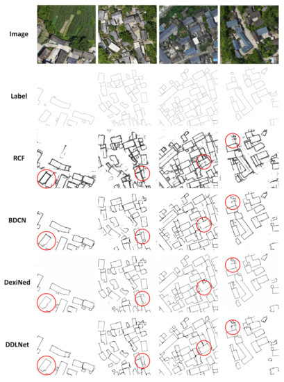 In the Zhonglu dataset, RCF, BDCN, DexiNed, DDLNet achieved boundary IoU values of 0.4378, 0.7050, 0.6326 and 0.7399 and achieved polygon IoU values of 0.5824, 0.7009, 0.6452 and 0.8719, respectively. The results of those semantic edge detection models on the Zhonglu test dataset are summarized in Table 2, and their performances are shown in Figure 9.