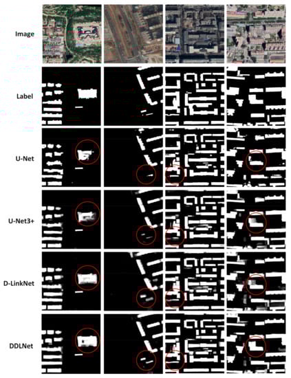 In the Beijing dataset, U-Net, U-Net3+, and D-LinkNet achieved 0.6726, 0.7161, and 0.7212 in polygon IoU, respectively. DDLNet achieved the top performance of 0.7527 of the polygon IoU, which was better than all other models, and even 4.36% more than D-LinkNet. U-Net3+ and DDLNet use the full-scale skip connection to help network learning, and they achieved boundary IoU of 0.4731 and 0.4746, respectively. This greatly surpassed the accuracy of U-Net and D-LinkNet, which achieve boundary IoU of 0.4281 and 0.4438, respectively. The results of those semantic segmentation models on the Beijing test dataset are summarized in Table 3, and their performances are shown in Figure 10.