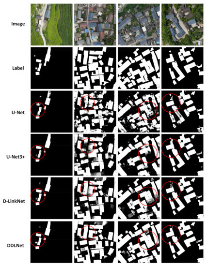 In the Zhonglu dataset, U-Net, Unet3+, and D-LinkNet achieved 0.7067, 0.8855, and 0.9261 in polygon IoU, respectively. DDLNet achieved the best performance of 0.9364 of the polygon IoU. U-Net3+ and DDLNet achieve boundary IoU of 0.5396 and 0.6905 which greatly surpassed the accuracy of U-Net and D-LinkNet. The results of those semantic segmentation models on the Zhonglu test dataset are summarized in Table 4, and their performances are shown in Figure 11.