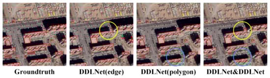 The results of postprocessing method with DDLNet on the Zhonglu dataset. DDLNet (edge) represent the edge result of DDLNet. In addition, DDLNet (polygon) represent the polygon result of DDLNet. DDLNet&DDLNet represent the result of postprocessing method. The blue circle mark shows the improvement of semantic segmentation where the boundary is closer to the real boundary of building, and the yellow circle mark shows the improvement of semantic edge where the disconnection edge was repaired completely.