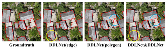 The results of postprocessing method with DDLNet on the Beijing dataset. DDLNet (edge) represent the edge result of DDLNet. In addition, DDLNet (polygon) represent the polygon result of DDLNet. DDLNet&DDLNet represent the result of postprocessing method. The blue circle mark shows the improvement of semantic segmentation where the boundary is closer to the real boundary of building, and the yellow circle mark shows the improvement of semantic edge where the disconnection edge was repaired completely.
