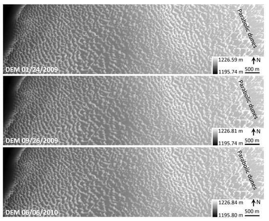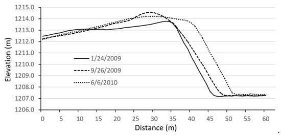 LiDAR point clouds acquired on 24 January 2009; 26 September 2009; and 6 June 2010 in the study area were downloaded from the OpenTopography Facility (www.OpenTopography.org, accessed on 2 March 2015) at the San Diego Supercomputer Center. LiDAR data acquisition and processing was completed by the National Center for Airborne Laser Mapping (NCALM—http://www.ncalm.org (accessed date 2 August 2021)). The point densities of the three datasets are 4.19 points/m2, 5.63 points/m2, and 4.62 points/m2, respectively. The horizontal coordinate system is NAD83 UTM Zone 13N, and the vertical coordinate system is NAVD88. The vertical accuracy of the datasets are less than 0.35 m. Figure 3 shows the digital elevation models (DEM) created from the multi-temporal LiDAR point clouds using Inverse Distance Weighted (IDW) interpolation with a cell size of 1 × 1 m. The IDW interpolation method was selected because (1) the LiDAR point densities are high enough for a cell size of 1 × 1 m; and (2) the results in this paper will be compared with the results from Dong [44] which was based on IDW interpolation of LiDAR points.