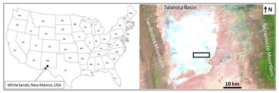 A study area of 9 × 2.4 km in the White Sands Dune Field (WSDF) in New Mexico, USA is selected. WSDF is a gypsum dune field with an area of about 500 km2 in the Tularosa Basin between the San Andres Mountains and the Sacramento Mountains (Figure 2). The deflation of evaporite beds of Lake Otero and other playa lakes in the basin is the major sediment source of WSDF [48]. The selected study area has three types of dunes—barchans, transverse, and parabolic—with up to 15 m in height. The general trend of the crestlines is NNW (345°), and the average spacing of the crestlines is 136 m (Ewing et al. 2006). The dominant winds from the SW–W are strongest during the winter–spring, while winds from the N–NW occur during the fall-winter, and winds from the S–SE occur during the spring–summer [48]. WSDF has been well documented in numerous studies [41,42,48,49,50,51].
