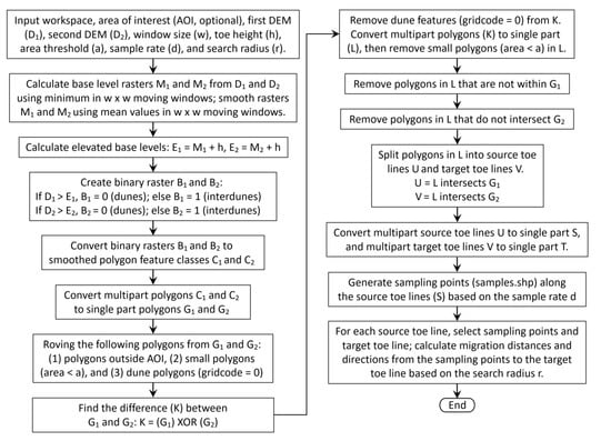 The methodology flowchart for toe line tracking (TLT) is shown in Figure 4. The process is implemented using the Python programming language and ArcPy for ArcGIS 10.7 with ArcGIS Desktop Advanced License. The user input parameters include workspace (folder for output files), area of interest (AOI, optional), first DEM (D1), second DEM (D2), window size (w), toe height (h), area threshold (a), sample rate (d), and search radius (r). With these initial parameters, the whole process in the flowchart is executed automatically. The flowchart can be implemented in other GIS packages. More details of the major steps in the flowchart are explained in the following sections.