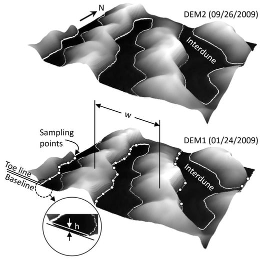 For an input DEM D(x, y) for sand dunes, the base level raster M(x, y) can be calculated using the minimum elevation in a w by w square window that moves across D(x, y). The user-specified window size w is determined by measuring the approximate distance between two dune crestlines (Figure 6). This is to ensure that, for any location in D(x, y), a minimum elevation in a neighboring interdune area can be used as output in M(x, y). An elevated base level raster E(x, y) is obtained by adding a constant toe height (h) to M(x, y)