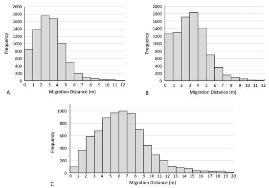 Histograms for dune migration distances. (A) 24 January 2009 to 26 September 2009; (B) 26 September 2009 to 6 June 2010; and (C) 24 January 2009 to 6 June 2010.