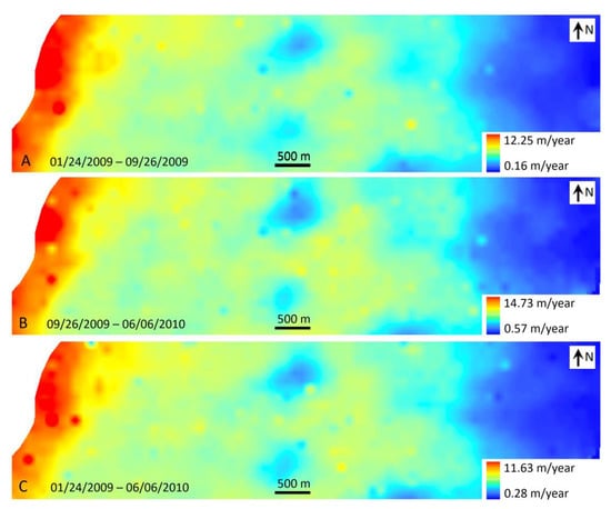 Raster maps created using Kriging interpolation (search radius: 300 m, cell size: 120 m) to show the spatial distribution of dune migration rates from (A) 24 January 2009 to 26 September 2009; (B) 26 September 2009 to 6 June 2010; and (C) 24 January 2009 to 6 June 2010.