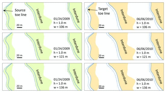 Interdune areas derived from the 24 January 2009 and 6 June 2010 DEMs using the TLT method, with h = 1.0 m and w = 106 m, 121 m, and 136 m, respectively. The source toe lines (dashed lines) and target toe lines (solid lines) obtained using w = 121 m are also shown as reference.