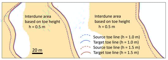 Figure 17 shows the source toe lines and target toe lines using 1.0 m and 1.5 m as the toe height (h), with interdune areas of h = 0.5 m as the background. It can be seen that the extracted toe lines are very close when h = 0.5, 1.0, and 1.5 m. The similarities in output toe lines can be explained using basic trigonometry: suppose the leeward slope is 30°, when the toe height h increases from 1.0 m to 1.5 m, the horizontal shift of the toe line is 0.5/tan(30°) = 0.87 m. Since the DEM cell size is 1 m, minor horizontal shifts (less than 1 m) in the toe line can results in the same polyline after raster to polygon conversion and polygon smoothing.