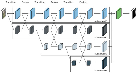 The HRNet-v2 model was developed to estimate human poses in high-resolution images [44]. Most deep learning networks for semantic segmentation include a process of spatial downsampling for the extraction of features from an image, followed by a restoration process to recover the original spatial resolution [9,10,11,12,13,14,15]. In contrast, HRNet-v2 consists of subnetworks based on images decomposed into multiple spatial resolutions in parallel, and the feature maps are constructed by repeatedly using modules to fuse the outputs of the subnetworks [44,45]. As shown in Figure 1, HRNet-v2 is composed of transition and fusion modules based on subnetworks formed of residual blocks. In the transition process, to learn and extract more comprehensive features, a subnetwork in which the number of channels is doubled but the resolution of the feature map is halved is added on the basis of the subnetwork with the smallest spatial resolution. In each subnetwork, a ResNet structure composed of a 3 × 3 convolutional layer, batch normalization, rectified linear unit (ReLU) activation, and a skip connection is applied. A fusion module is then applied to exchange the information among the multiresolution layers generated by the transition module. The features of each subnetwork are fused by adjusting the spatial resolution and the number of channels to those of the standard subnetwork [44]. Finally, the multiresolution layers of the final fusion module are concatenated, and then the output is determined by a convolutional layer.