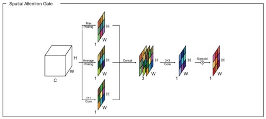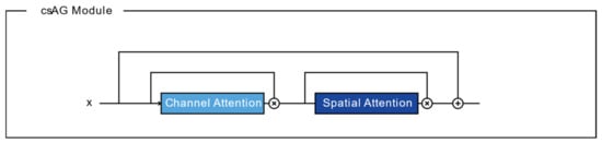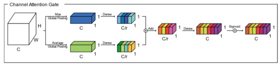 The structure of the csAG module is composed of a channel attention gate and a spatial attention gate. Generally, attention gates generate a context vector that assigns weights to the input data. Therefore, they highlight the features of interest and suppresses irrelevant areas [11]. A channel attention gate selects a representative value for each channel using global pooling and dense layers. In this manuscript, we modify the channel attention gate proposed by Khanh et al. [46]. Figure 2 presents the structure of the channel attention gate used in our algorithm. Through global max pooling and average pooling layers, input with dimensions of is reshaped to feature maps with dimensions of to aggregate the spatial information of the input. The average-pooled and max-pooled features are condensed by a multilayer perceptron based on a reduction ratio , and then each feature map is merged using elementwise summation. Finally, the feature map of the channel attention gate is determined using a multilayer perceptron and the sigmoid function. Each value of the channel attention-gated layer represents the weight of a channel for feature extraction. Meanwhile, a spatial attention gate selects representative values for all channels located in the corresponding pixel. As shown in Figure 3, through the concatenation of feature maps from two pixelwise pooling and convolutional layers, input with dimensions of is reshaped to a feature map with dimensions of to highlight the information-containing regions in the feature map. The final output of the spatial attention-gated layer is generated by a convolutional layer and the sigmoid function. The csAG module focuses on highlighting the channels and locations of the important information in the feature map. The csAG module is constructed with a sequential arrangement, as shown in Figure 4. In particular, the csAG module uses a residual structure, and the values from the channel and spatial attention gates are applied to the feature map through elementwise multiplication.
