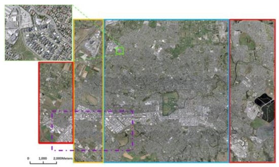 The WHU building dataset is composed of polygon data corresponding to individual building boundaries and aerial images (RGB bands) with a 0.3 m spatial resolution and 8-bit radiometric resolution collected by Land Information New Zealand (LINZ) [48]. It consists of more than 220,000 buildings extracted from aerial images with a 0.075 m spatial resolution covering a 450 km2 area in Christchurch, New Zealand [48]. The dataset is downsampled to a 0.3 m spatial resolution. It provides a total of 8189 patches of 512 × 512 pixels in size and consists of a training set of 4736 patches with 130,500 buildings, a validation set of 1036 patches with 14,500 buildings, and a test set of 2416 patches with 42,000 buildings, as shown in Figure 7. The ground-truth data were constructed through manual editing of Christchurch’s building vector data.