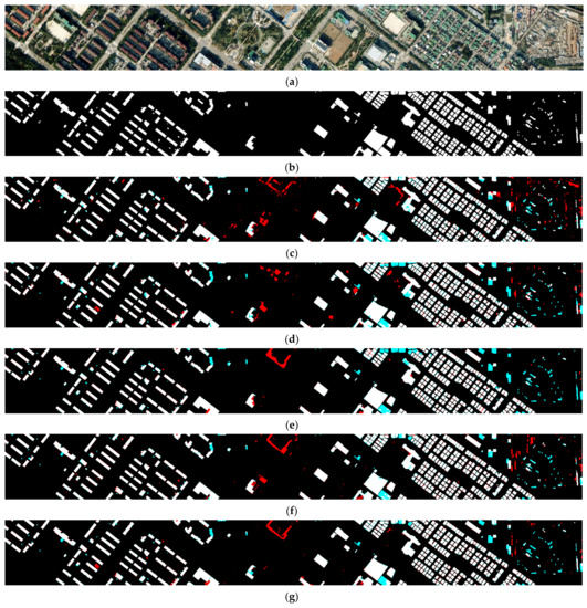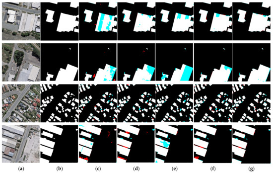 Building extraction results for test dataset 2 (industrial area) according to each deep learning model. The red and cyan regions indicate false positives and false negatives, respectively. (a) Original image. (b) Ground-truth labels. (c) Results of SegNet. (d) Results of U-Net. (e) Results of FC-DenseNet. (f) Results of HRNet-v2. (g) Results of csAG-HRNet.