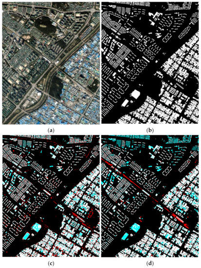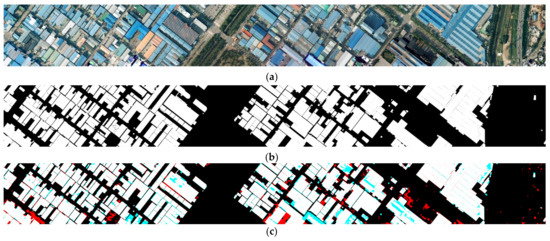 To evaluate the performance of the proposed algorithm, we estimated the accuracy of the building extraction results based on the confusion matrix. The form of the confusion matrix is shown in Table 1. In the confusion matrix, the true positive (TP) entry refers to the number of positives that are predicted to be positive, the false positive (FP) entry indicates the number of negatives that are predicted to be positive, the true negative (TN) entry is the number of negatives that are predicted to be negative, and the false negative (FN) entry gives the number of positives that are predicted to be negative.
