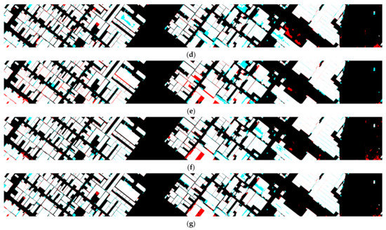Detailed results for site 1 (residential area) according to each deep learning model. Red indicates false positives, and cyan indicates false negatives. (a) Original image. (b) Ground-truth labels. (c) Results of SegNet. (d) Results of U-Net. (e) Results of FC-DenseNet. (f) Results of HRNet-v2. (g) Results of csAG-HRNet.