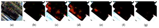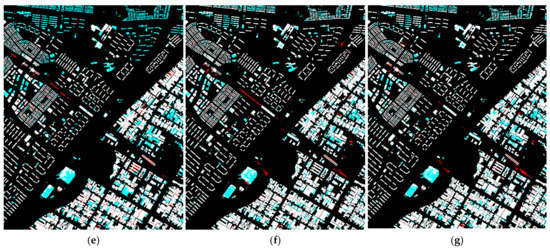 The apartments and houses area of site 1 is adjacent to the area used for the generation of the training dataset. Thus, it has characteristics similar to those of the training dataset. As shown in Figure 8c–g, some construction sites in the upper center were falsely detected as buildings. The upper right area includes many containers or small buildings, which are difficult to distinguish. However, compared to the other deep learning methods, the proposed method detected fewer nonbuilding areas, as highlighted in red. In particular, the false detection area of the proposed method was smaller than that of HRNet-v2. Figure 9 shows detailed results for the apartments and houses area of site 1. As shown in Figure 9c,d, SegNet and U-Net falsely detected pixels corresponding to the vacant lot next to a building as building pixels. Additionally, the unusual surface at the bottom of the image could not be detected as part of the building. As shown in Figure 9e, FC-DenseNet could not detect some building pixels and falsely detected shadow pixels as building pixels. HRNet-v2 also falsely detected some shadow pixels between buildings as building pixels, as shown in Figure 9f. In contrast, with the csAG-HRNet method proposed in this manuscript, false detection and non-detection were less common than with the other deep learning networks.