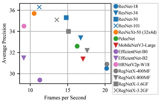 At first, we examine the usage of different backbone networks in Figure 5. Even though multiple modern architectures are used to replace ResNet [65] as backbone, ResNet still offers the best trade-off between detection accuracy and runtime. While certain configurations of RegNetX [66] are a suitable alternative to ResNet, using light-weight networks, e.g., PeleeNet [49], MobileNetV3-Large [45] and EfficientNet [48] results in clearly worse AP. Backbones targeted towards a high accuracy like ResNeXt [67] or HRNetV2 [68] also provide an inferior trade-off between detection accuracy and runtime compared to ResNet.