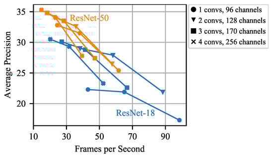 Thus, our focus lies on optimizing the inference time spent for the classification head by reducing the number of stacked convolutions and the number of channels as described in Section 3.4. Results for different configurations of number of stacked convolutions and number of channels are shown in Table 11. The best trade-offs between inference time and detection accuracy are achieved for 3 stacked convolutions and 170 channels and 2 stacked convolutions and 128 channels, respectively. Removing more convolutions or channels results in worse AP. Note that a balanced adaption of these parameters is appropriate to avoid a large drop in AP. The impact of reducing the resolution as a further scaling factor is shown in Figure 6. For each configuration, the input image resolution is varied between and pixels. Decreasing the input image resolution to pixels shows a large speed up with only a small drop in AP for all configurations, while for an input image resolution of pixels the AP becomes considerably worse.