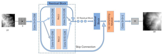 The architecture of the proposed network is shown in Figure 2 and Figure 3, and is composed of three main sub-networks, namely the feature extraction, residual, and up-sampling modules. The specific structure and functions of the three modules are as follows: