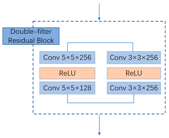 - The residual module consists of 32 small residual modules. The function of these residual modules is to increase the depth of the network, and further extract and fuse the feature maps generated by filters with different receptive fields. Each small residual module includes two different filter branches (i.e., 3 3, 5 5), each branch includes two convolution layers, and the activation function links the two convolution layers, as shown in Figure 3. We concatenate the feature map extracted from the two branches at the end of each residual module.