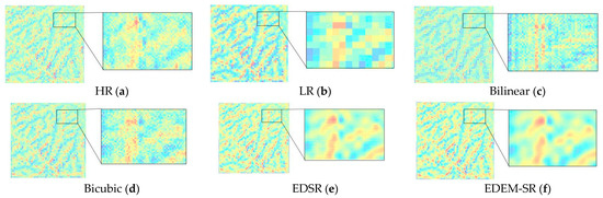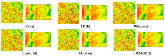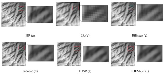 DEM reconstruction results: (a) is the high-resolution 12.5 m DEM; (b) is the low-resolution DEM with 50 m resolution; (c,d) are the bilinear and bicubic results; (e) is the EDSR result, and (f) is the EDEM-SR result. The above reconstruction results were all generated using an up-scaling factor of 4.