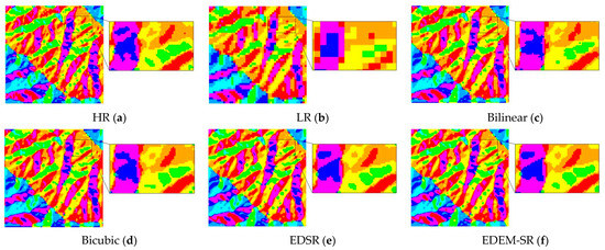 Figure 8 show the terrain parameters for DEMs reconstructed by different methods at the scale of 4. The color difference between Figure 8a, Figure 9a and Figure 10a and other images series shows the ability of different methods to maintain the terrain features. Figure 8c, Figure 9c and Figure 10c show the slope, aspect, and curvature for a DEM reconstructed by bilinear interpolation. From its color change, it can be seen that the bilinear method eliminates the slope decline, connects several adjacent areas with similar aspects, and the curvature is quite different from the original curvature. Specifically, the color transition of Figure 8c is not obvious, the regions separated in Figure 9a are connected in Figure 9c, and Figure 10c has an obvious artificial texture. Figure 8d, Figure 9d and Figure 10d show the terrain parameters for a sample DEM reconstructed by bicubic interpolation. The method’s performance is better than bilinear, but it has similar problems maintaining the terrain parameters. Interpolation methods all have shortcomings associated with the preservation of fuzzy and smooth terrain features. Figure 8e, Figure 9e and Figure 10e and Figure 8f, Figure 9f and Figure 10f show the results of EDSR and EDEM-SR, respectively. It can be seen that the color changes for these two methods are close to the original DEM, which confirmed that the terrain features reconstructed by the deep learning methods are close to those in the original DEM. Compared with the DEMs reconstructed by interpolation methods, the DEMs reconstructed by our method show many of the same features as the original DEM.