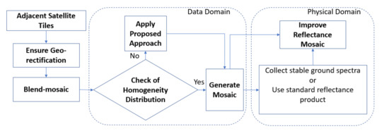 36]. The RANSAC approach is used again as a robust approach for further removing the spectral outliers across each band. A linear function is determined to map the spectrally-consistent pixels for each band of a tile to map it onto the base image tile to create the homogeneous mosaic. The overview of the proposed process can be found in